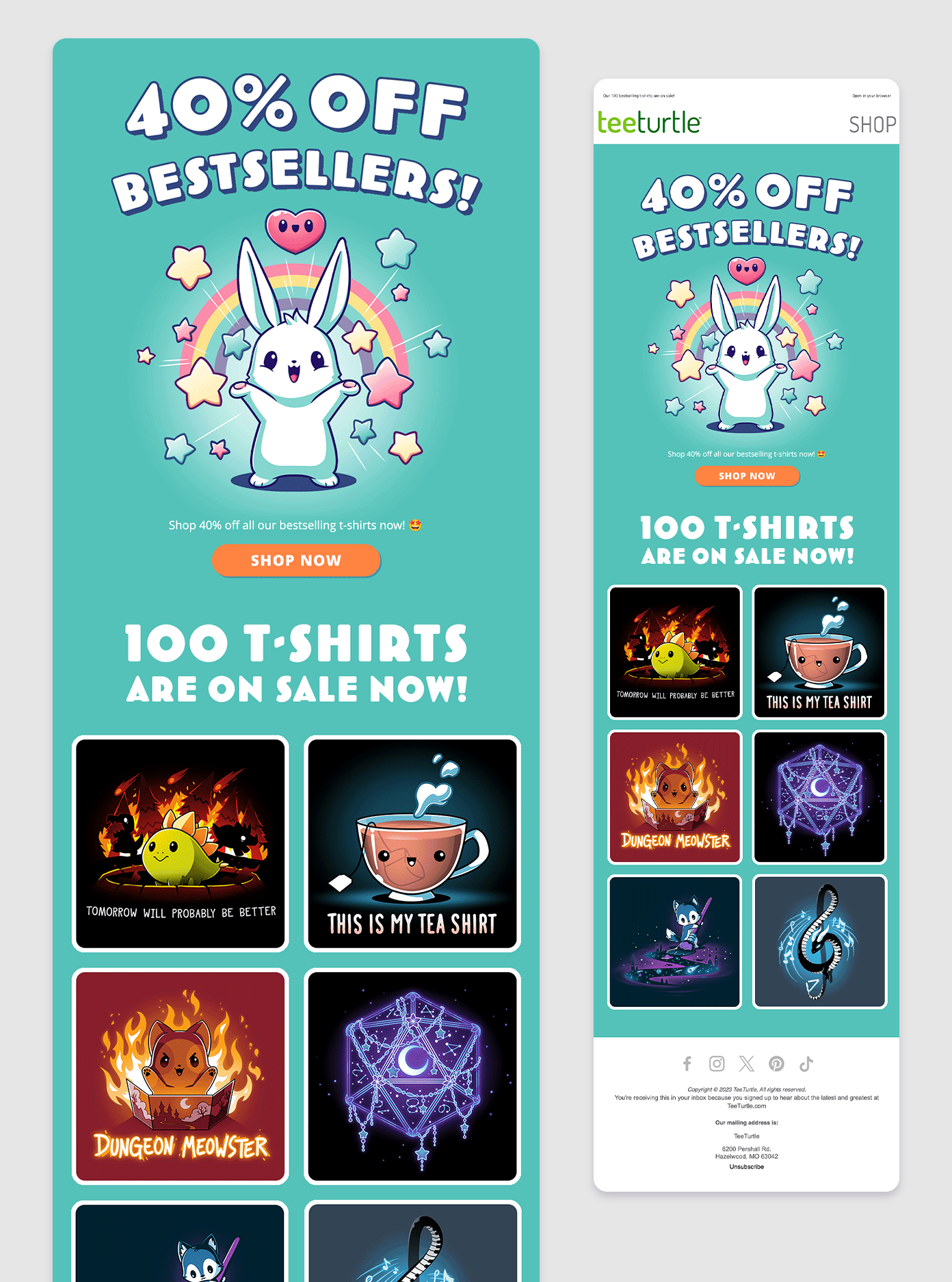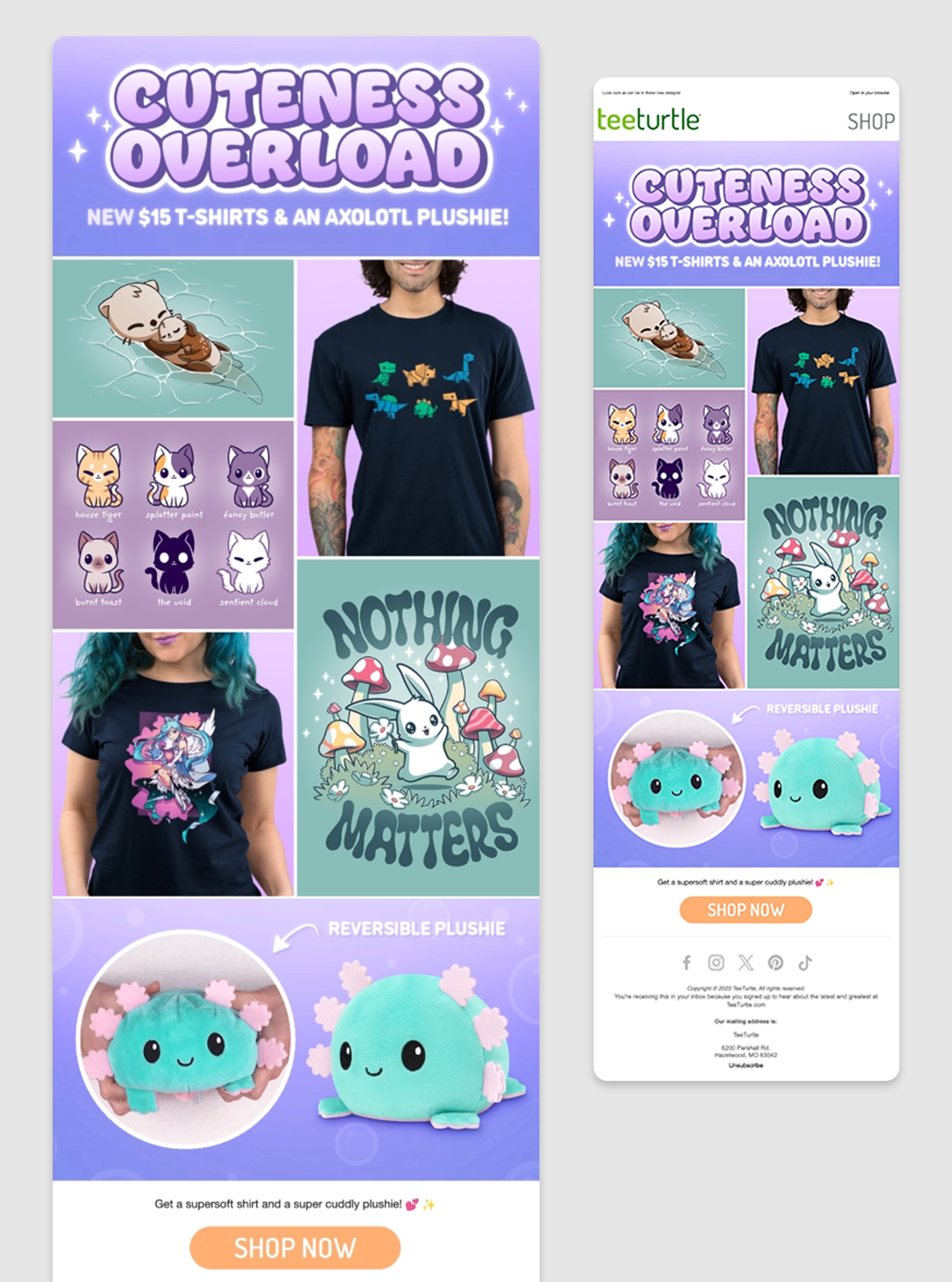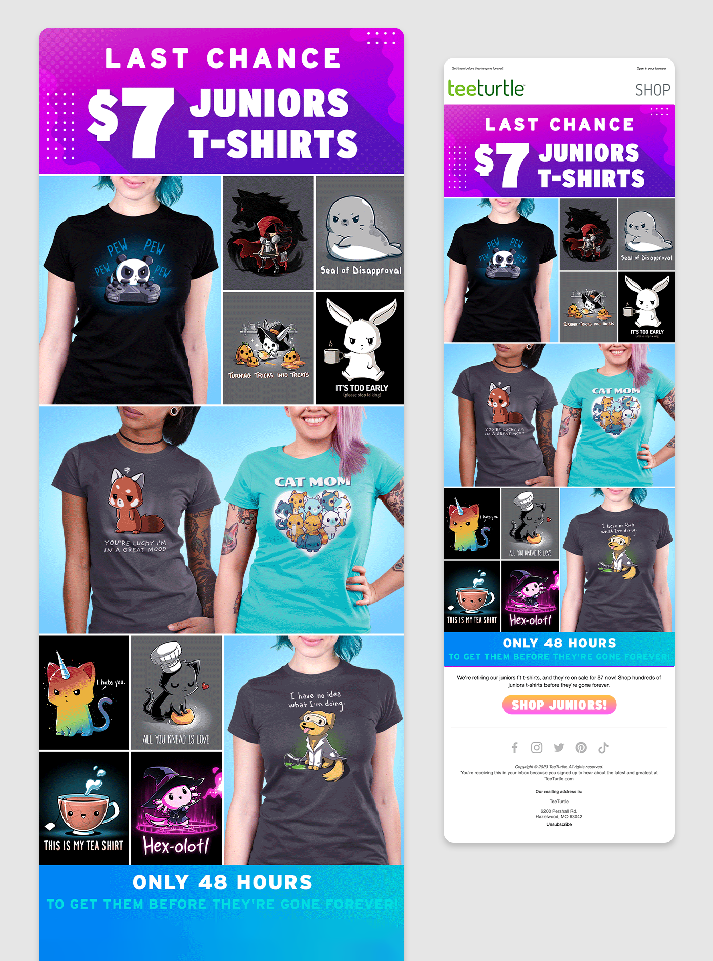 A cohesive body of email creatives that supported TeeTurtle’s ongoing promotional calendar, reinforced brand presence, and delivered visually engaging designs for multiple short-lived campaigns.
