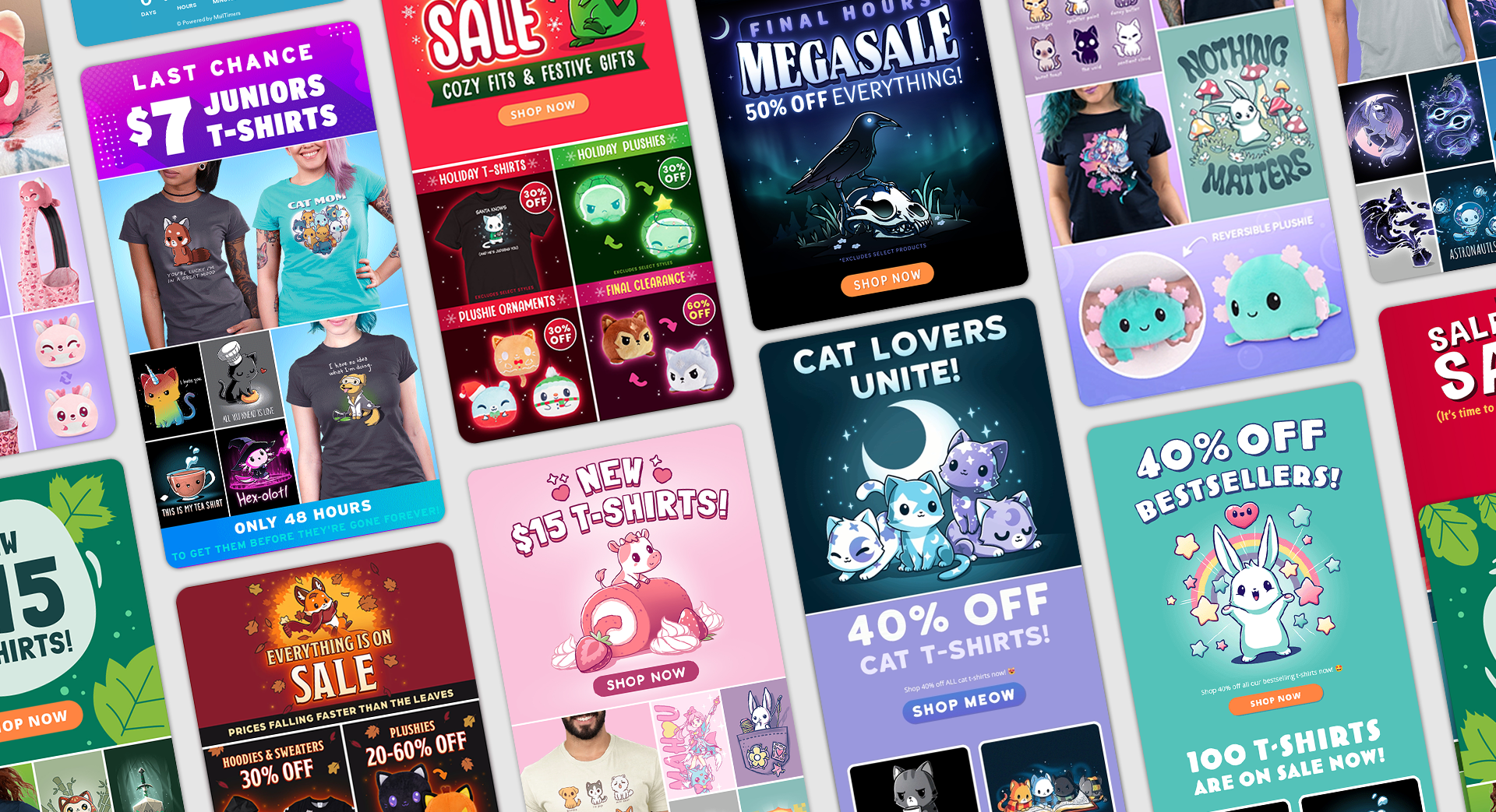 A collection of branded email graphics produced for TeeTurtle’s short-run marketing initiatives. Work includes themed sales, general promotions, and new product releases, typically single-send campaigns with quick turnarounds.